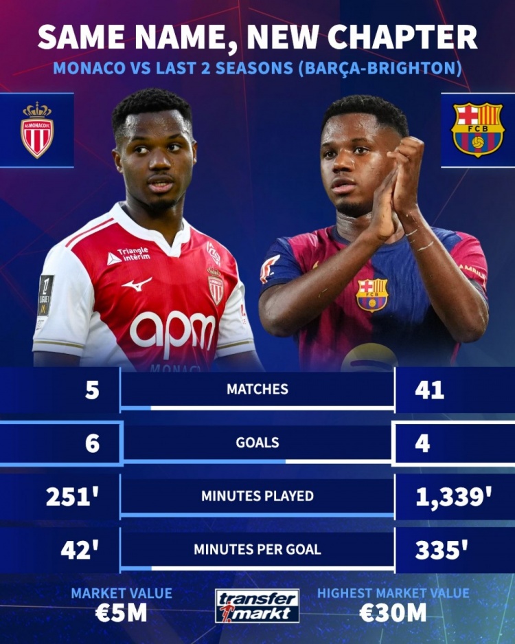 焕发新生!法蒂过去两个赛季41场打进4球,本赛季在摩纳哥5场6球