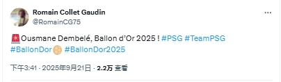 该记者表示:“奥斯曼-登贝莱,2025年金球奖得主!”这位记者供职于多家法国正规媒体,有比较高的可靠度。