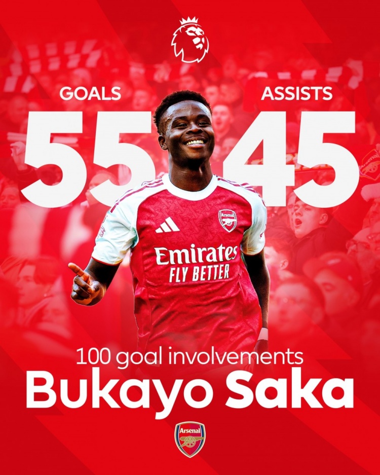 英超官方社媒晒海报向萨卡表示祝贺,并配文写道:萨卡在英超联赛中参与进球数突破100个