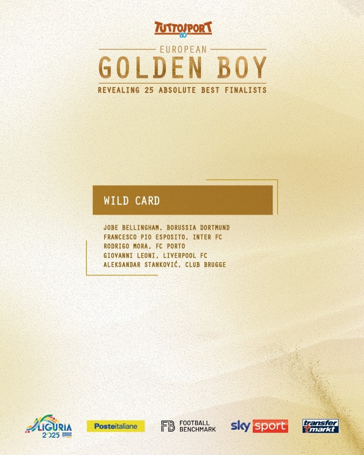 10月15日讯 金童奖公布25人候选,库巴西、杜埃、怀森、斯凯利、居莱尔、小贝林厄姆在列。