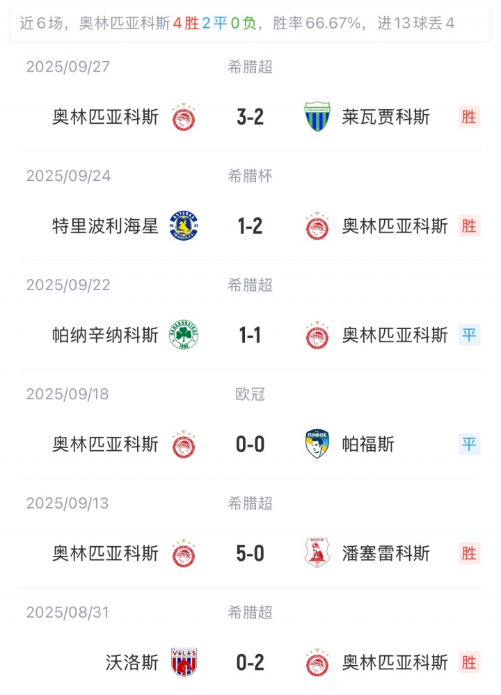 阿森纳首轮2-0客胜毕尔巴鄂,奥林匹亚科斯0-0战平帕福斯。阿森纳与奥林匹亚科斯此前在欧战共交手12次,打成6胜6负。两队上一次交手是2020/21赛季欧联杯1/8决赛,阿森纳两回合3-1、0-1淘汰对手。